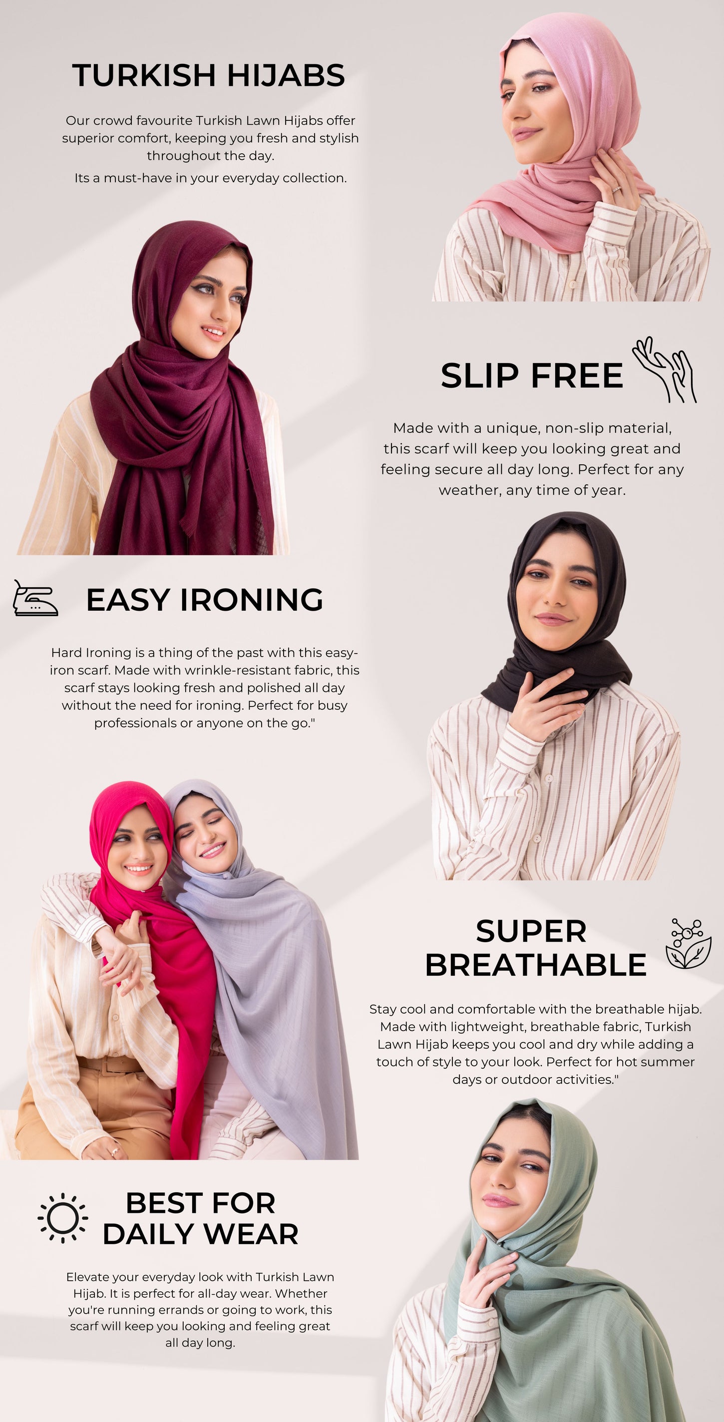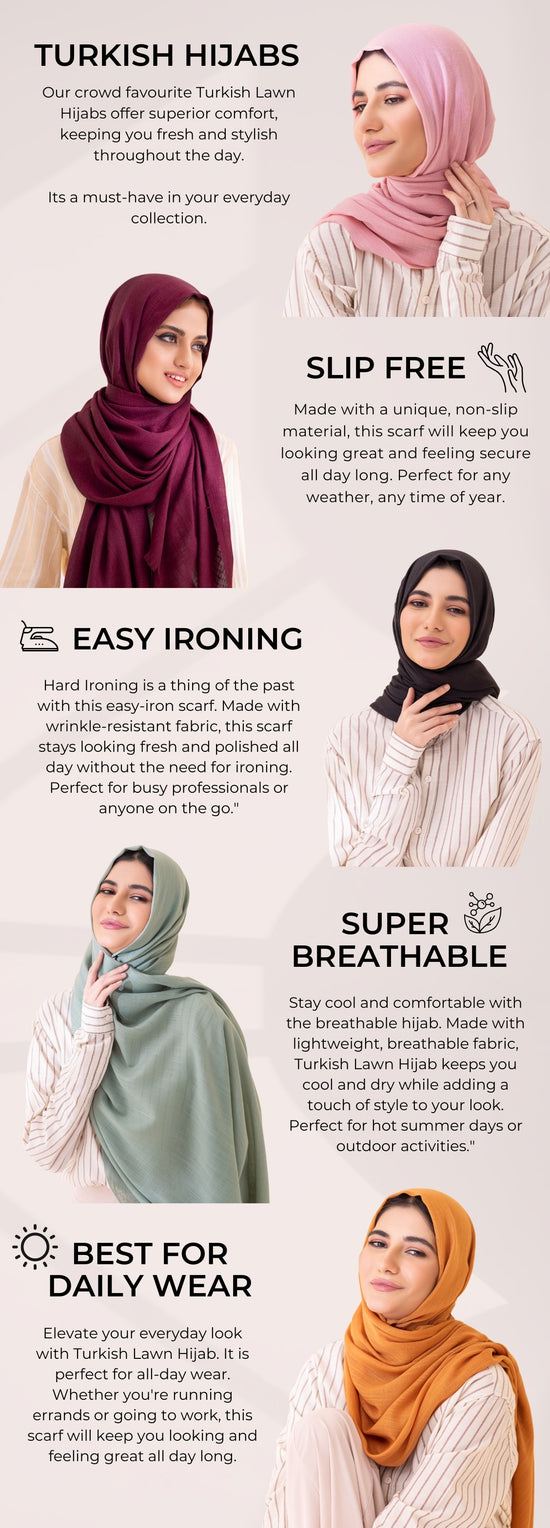 Turkish Lawn Hijabs and Scarves are made from soft and lightweight lawn fabric that’s comfortable enough for daily wear in summer and all weathers. They keep warm during winter season through multiple layers. The material of these headscarves makes them perfect for semi-formal to casual wear. They're perfect for hijabs/niqabs, ensuring full coverage with easy styling and drape.